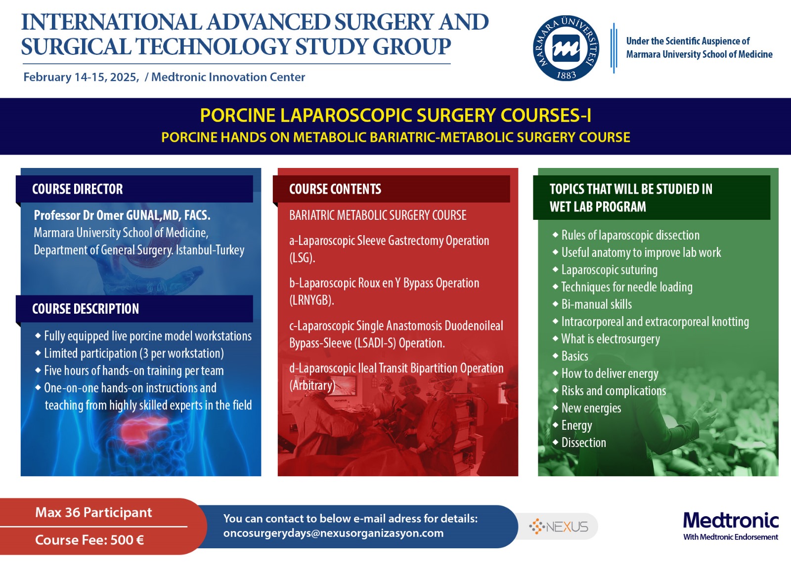 UCGOD tarafından düzenlenen bu uygulamalı kurs, metabolik ve bariatrik cerrahi alanında deneyim kazandırmayı amaçlamaktadır. Uluslararası kursiyerlerin katılımıyla gerçekleştirilen programda, domuz modeli üzerinde pratik eğitimler sunulmuş ve güncel cerrahi teknikler deneyimli eğitmenler eşliğinde uygulamalı olarak öğretilmiştir.